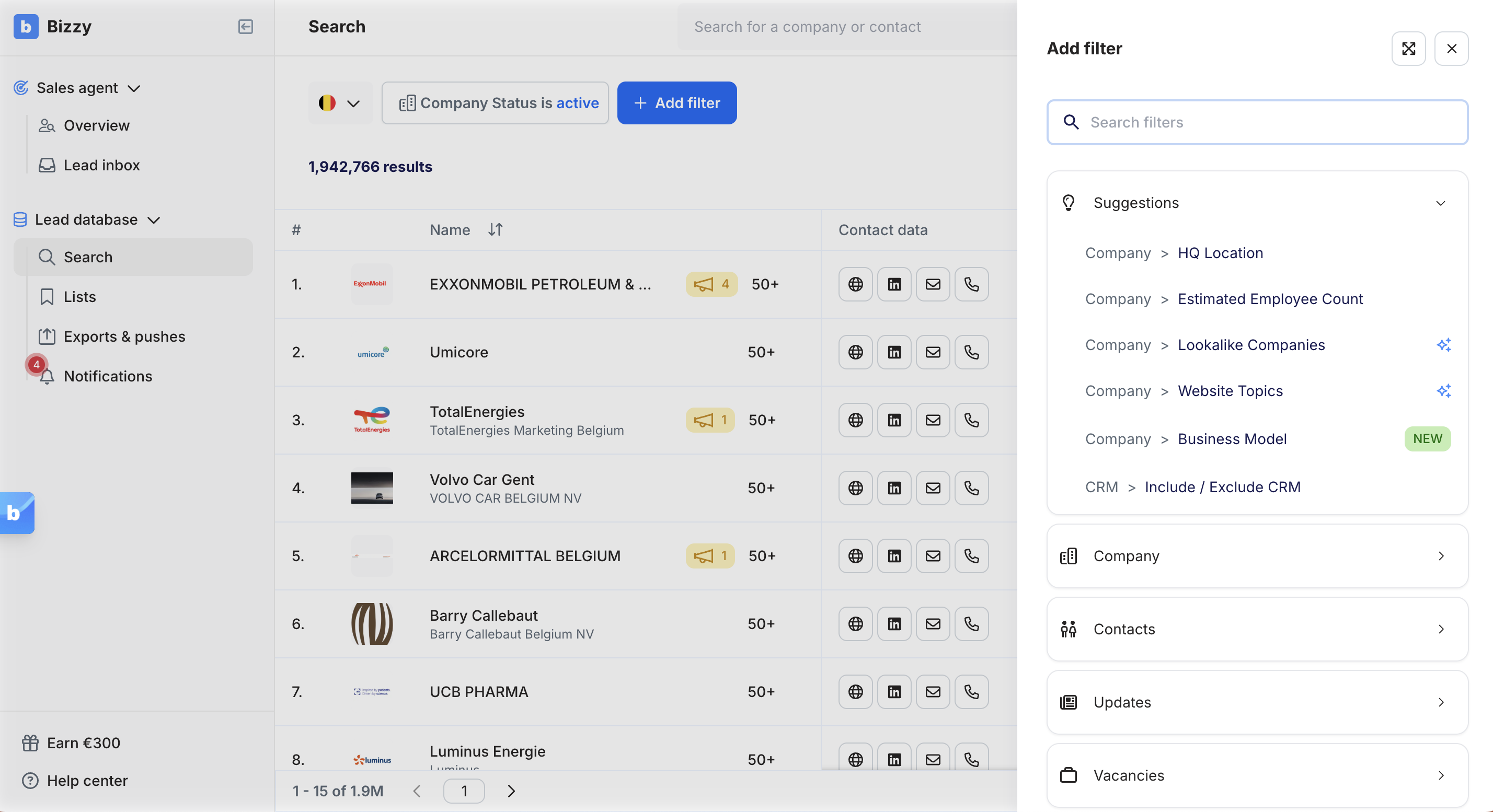 Filters in Bizzy helpen je om je zoekresultaten te verfijnen binnen onze bedrijvendatabase, die alle bestaande bedrijven bevat in het land waarin je zoekt. Ze helpen je om prospectlijsten op te bouwen die overeenkomen met je Ideal Customer Profile (ICP) en om je te focussen op de organisaties en contactpersonen die het meest relevant zijn voor je doelmarkt.
